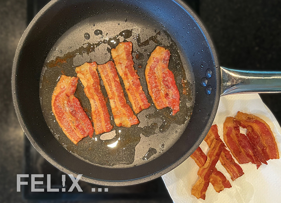 Das entstandene Fett kann abgesiebt im Kühlschrank aufbewahrt werden (immerhin gut 2 EL!): etwas damit anbraten, einem Brotteig beifügen usw.
