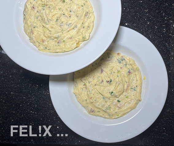 Kartoffelmasse auf zwei tiefe Teller geben (siehe Tipp), oder aber in eine ofenfeste 2-Portionen- Form.