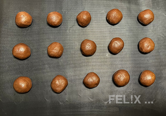 Aus dem Teig Baumnuss-grosse Kugeln zu 15 g formen, mit etwas Abstand auf Backfolie oder -papier setzen (15 Stück pro Blech), sie verlaufen beim Backen leicht.