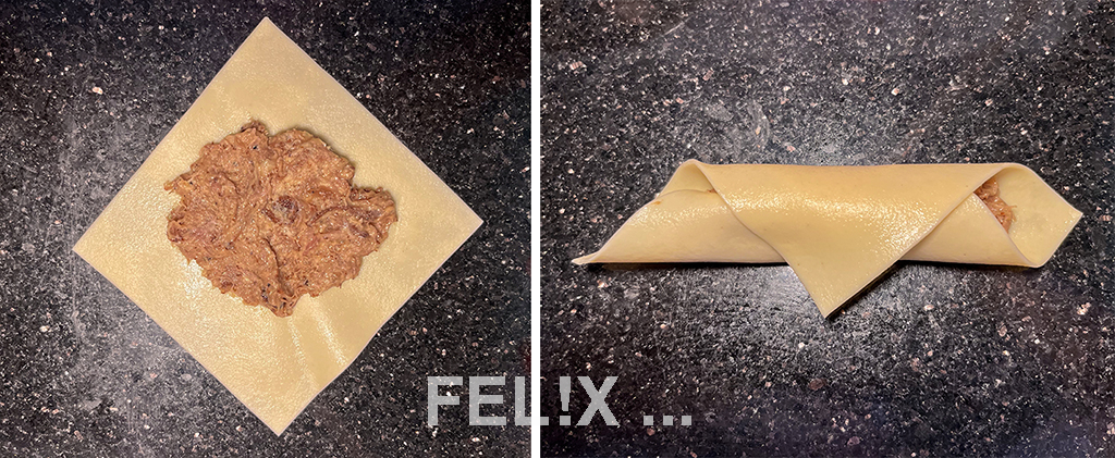 Je ca. 40 g der Füllung mittig darauf verteilen.