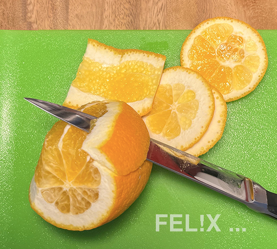 Von den Orangen oben und unten einen Deckel wegschneiden. Schale mit einem scharfen Messer streifenweise dick abschälen, so dass auch die weisse Innenhaut entfernt wird.