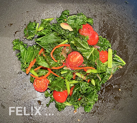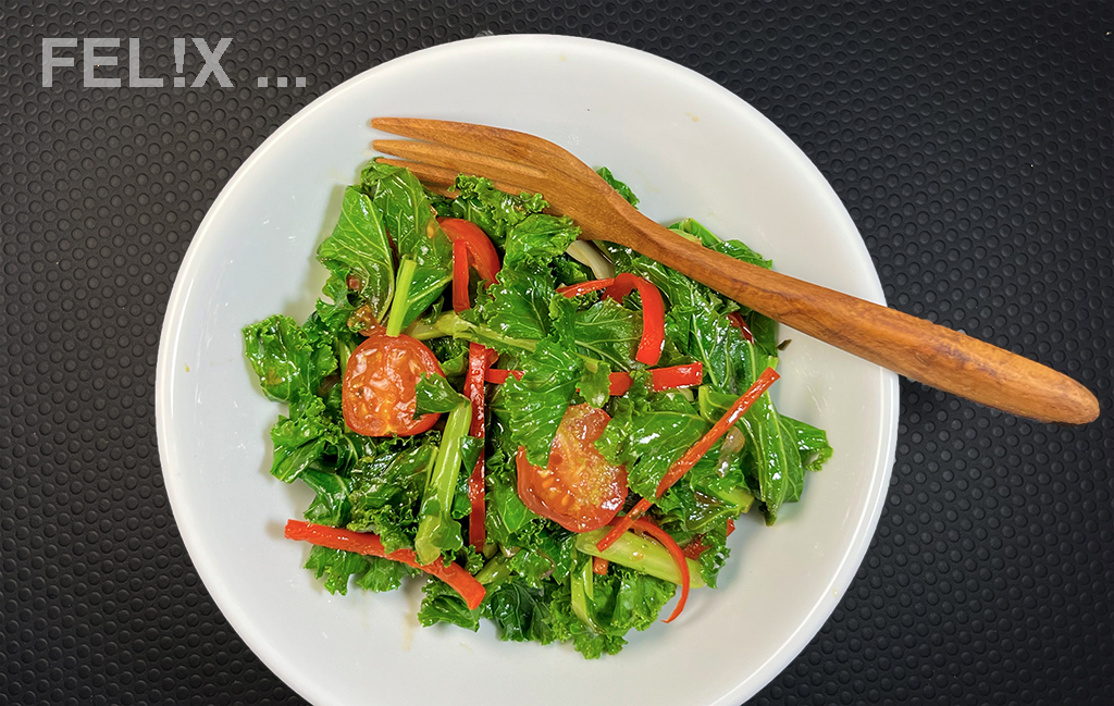 Für mich muss Grünkohl knackig bleiben, dazu blanchiere ich die in Stücke geschnittenen Blätter nur ganz kurz und mische sie ganz zum Schluss unter weitere, vorbereitete Zutaten.