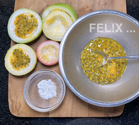 2Die Passionsfrüchte halbieren, Mark samt Kernen herauslöffeln (= ca. 75 g).