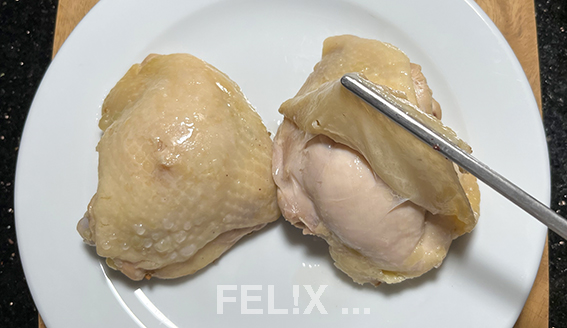 Pouletschenkel herausheben, auf einen Teller setzen. Dabei Ingwer und Koriander abstreifen, Haut ablösen und entsorgen*.