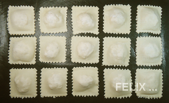 • Mit einem Ravioli-Stempel (auf dem Bild: 7 cm) ausstechen oder mit einem gezackten Teigrädchen quadratische Ravioli ausschneiden.