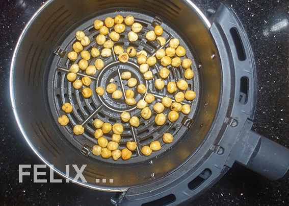 1Haselnüsse in der Heissluft-Fritteuse bei 180 °C 6–8 Minuten (oder in einer beschichteten Pfanne) ohne Fett hellbraun rösten.