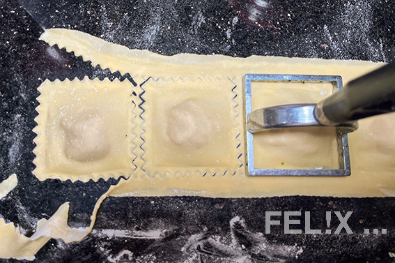Aber auch mit einem Ravioli-Stempel ist das Formen einfach, oder – wenn nichts dergleichen verfügbar ist – mit einem Teigrädchen.