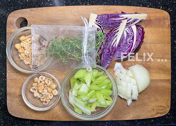 Mit Sellerie und Zwiebeln, Rotkohlspalten, ein paar Gewürzen und Rotwein geschmort, entsteht eine veritable Köstlichkeit.