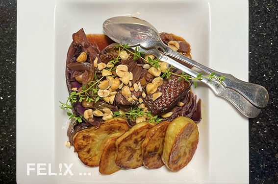Dazu passt eine Kartoffelbeilage – ich habe in Cognac marinierte Karoffelscheiben dazu gereicht, siehe hier!