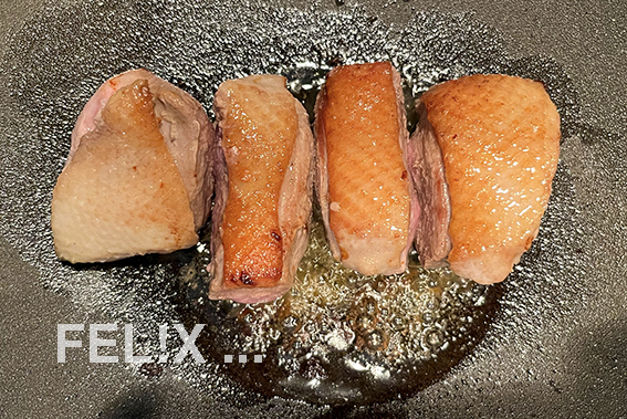 Entenbrust in 4 gleich grosse Teile schneiden.