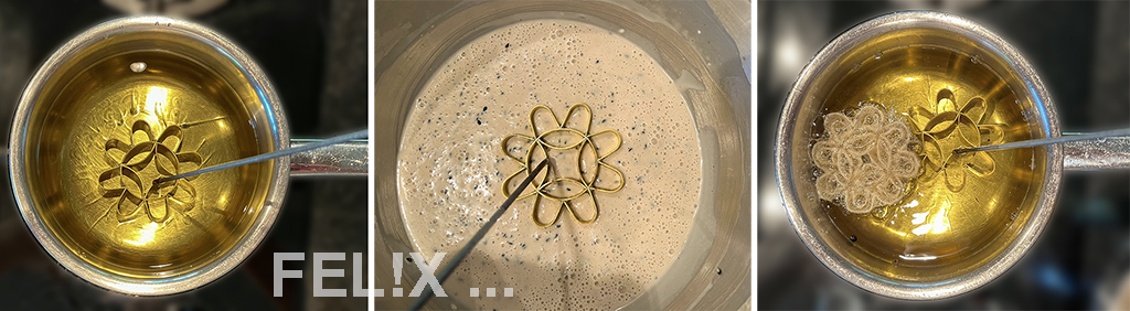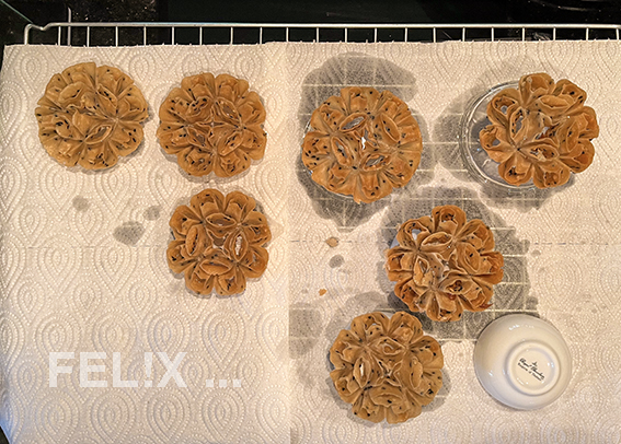 • Aus dem Öl heben, auf die Rundung eines Schälchens setzen und dabei etwas auseinanderdrücken, damit eine Wölbung entsteht und sich das Küchlein wie eine Blüte öffnet.