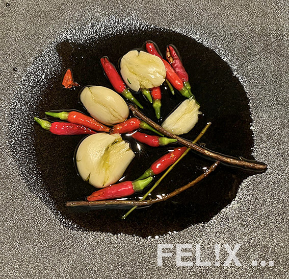Chilis aufschlitzen, Knoblauch leicht quetschen [ich hatte auch noch ein paar leergezupfte Rosmarinstängel].