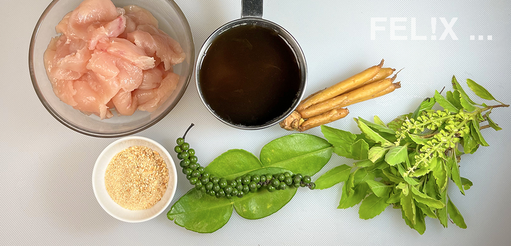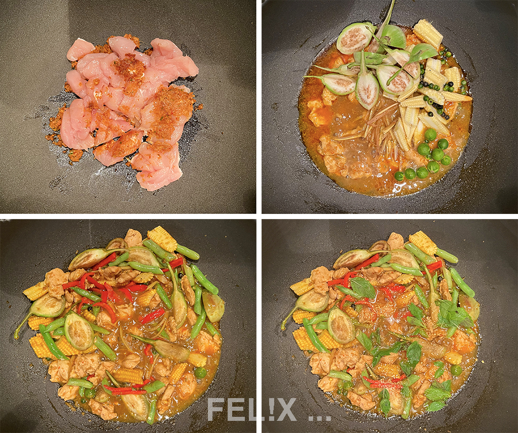 Basilikum und «Khao Khua» erst ganz zum Schluss daruntermischen, nicht mehr kochen lassen.