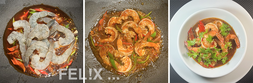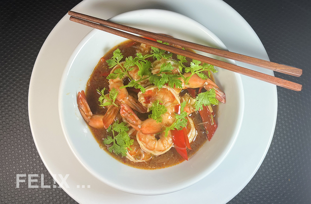 Inspiration: «Magentratzerl», Susanne hat das Gericht aus einem China-Kochbuch mit Kalmar-Ringen nachgekocht. Ich habe das Rezept für Garnelen etwas angepasst.