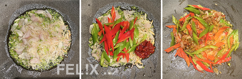 Schliesslich Peperonistreifen und Bohnen-Chili-Paste beigeben, Gemüse bissfest garen.