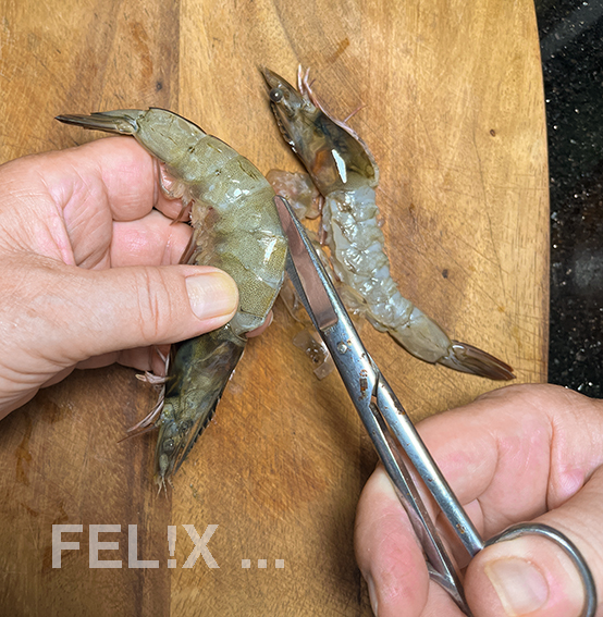 Schälen, das letzte Segment mit der Schwanzflosse belassen. Köpfe entfernen, Darm (schwarzer Faden) herausziehen.