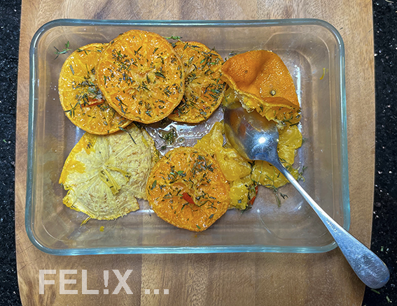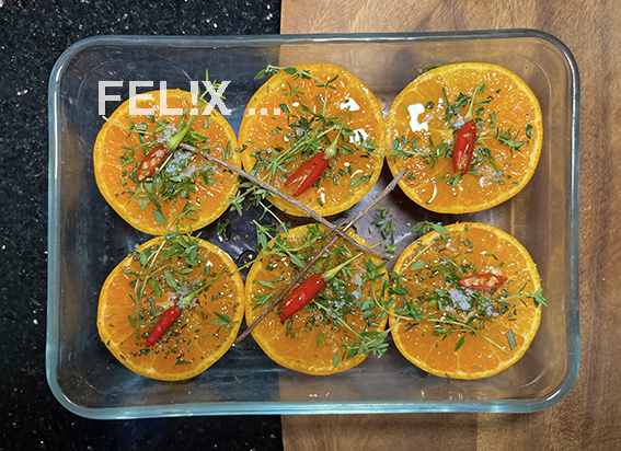 Also habe ich mal die hier in Thailand als Orangen = «som» bezeichneten Tangerinen mit oben erwähnten Kräutlein confiert und daraus eine Sauce zubereitet – das Resultat ist umwerfend!
