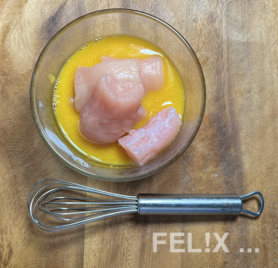 Hähnchenfleisch in 12 mundgerechte Stücke schneiden.