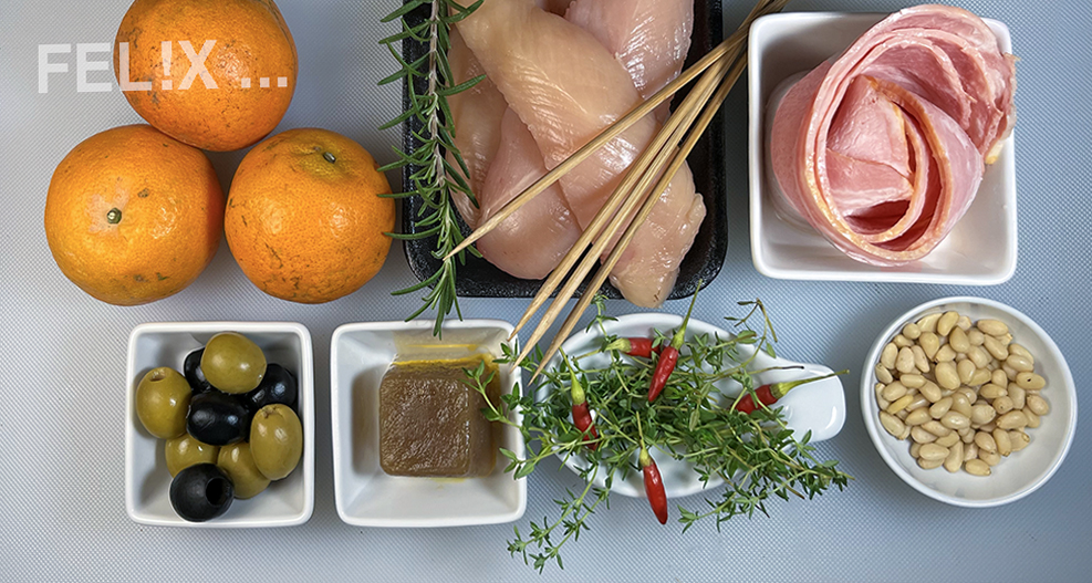 HÄHNCHENSPIESSE MIT SPECK UND OLIVEN AUF CONFIERTER TANGERINEN-SAUCE