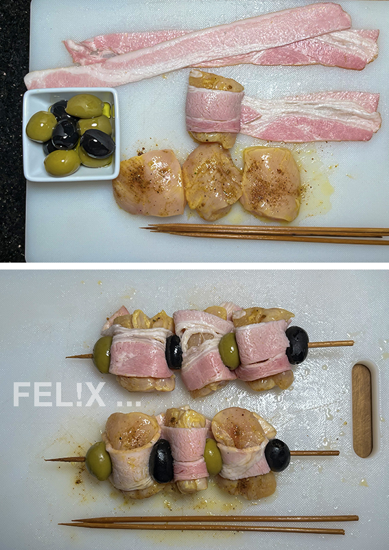 Dazu gibt es Hähnchenspiesse mit Speck und Oliven.