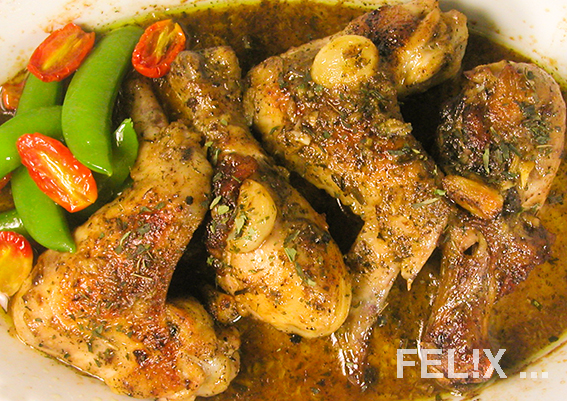 6 der Knoblauchzehen zu den Geflügelteilen geben, die restlichen Zehen in der Flüssigkeit zu einer sämigen Sauce zerdrücken, was am besten mit einer Gabel geschieht.