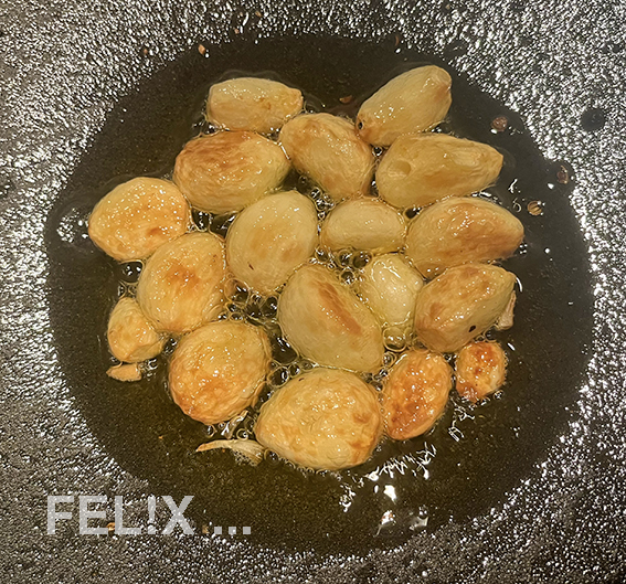 Knoblauchzehen in der selben Pfanne unter Wenden anbraten, bis sie etwas Farbe annehmen.