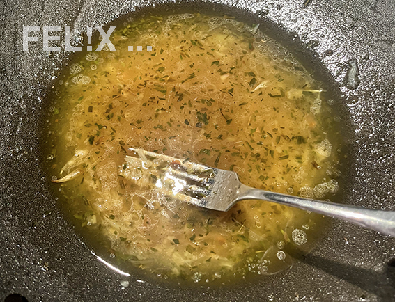 Mit Cognac und Fond ablöschen, Estragon zwischen den Fingern zerreiben, beifügen.