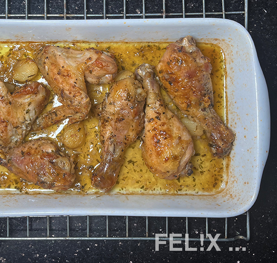 Sauce aufkochen, über die Geflügelteile giessen, im Ofen 15–20 Minuten fertig garen.