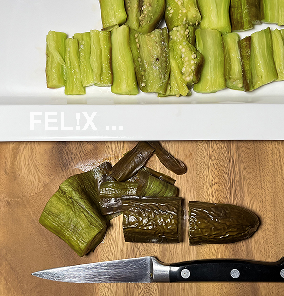 • 3–4 lange, grüne Auberginen, 450–500 g