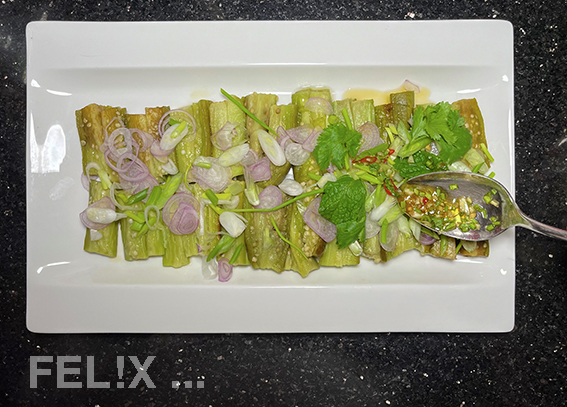Für nachstehenden Salat werden die zuerst aufgezählten, langen grünen Auberginen verwendet, weil diese auch nach dem Garen ihre hellgrüne Farbe behalten.